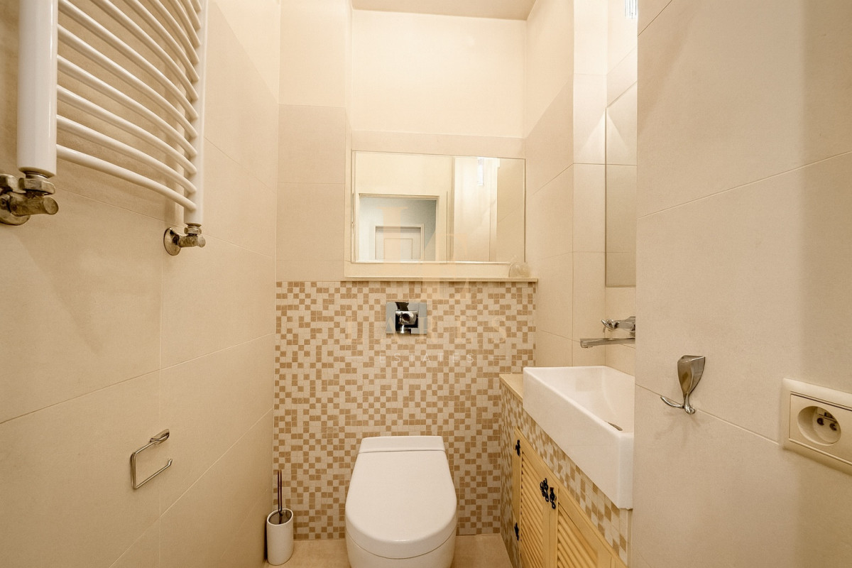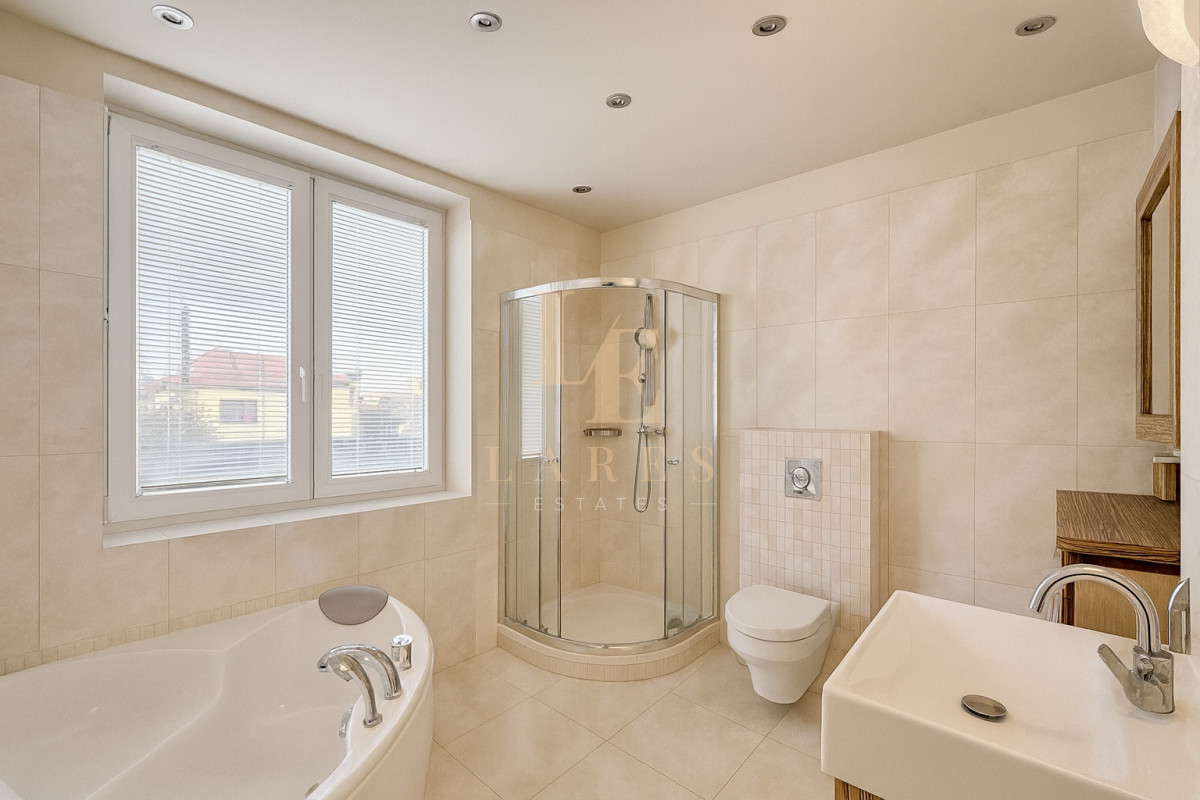 - łazienka z oknem wyposażona zarówno w wannę, jak i kabinę prysznicową