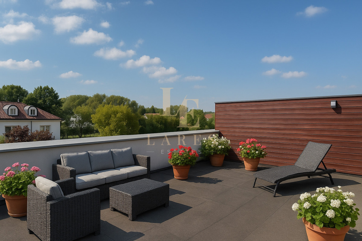 Otwarta przestrzeń ( 60 m2) wypoczynkowa z fotelami kinowymi, wyjście na taras dachowy (ok. 60 m²), podłączenie pod jacuzzi.