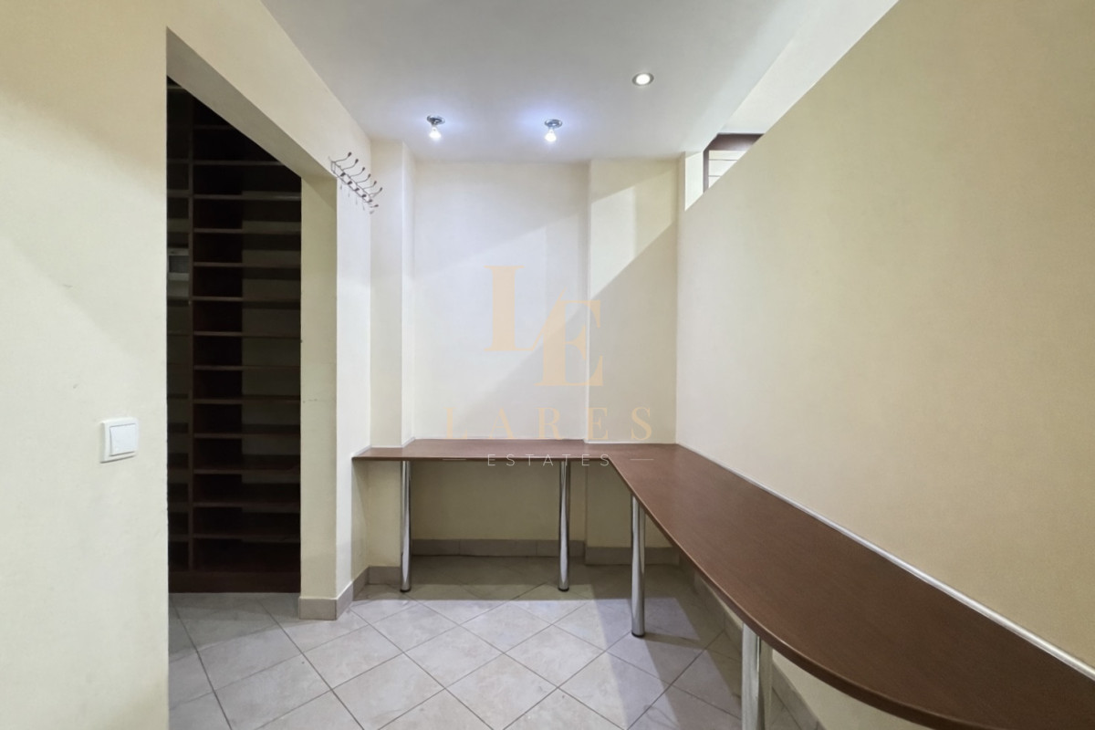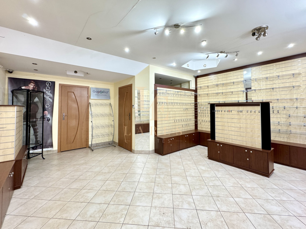 Lokal składa się z przestronnej sali głównej oraz dwóch oddzielnych pomieszczeń: zaplecza z regałami i wieszakami (magazyn) oraz zaplecza sanitarnego wyposażonego w WC i umywalkę.