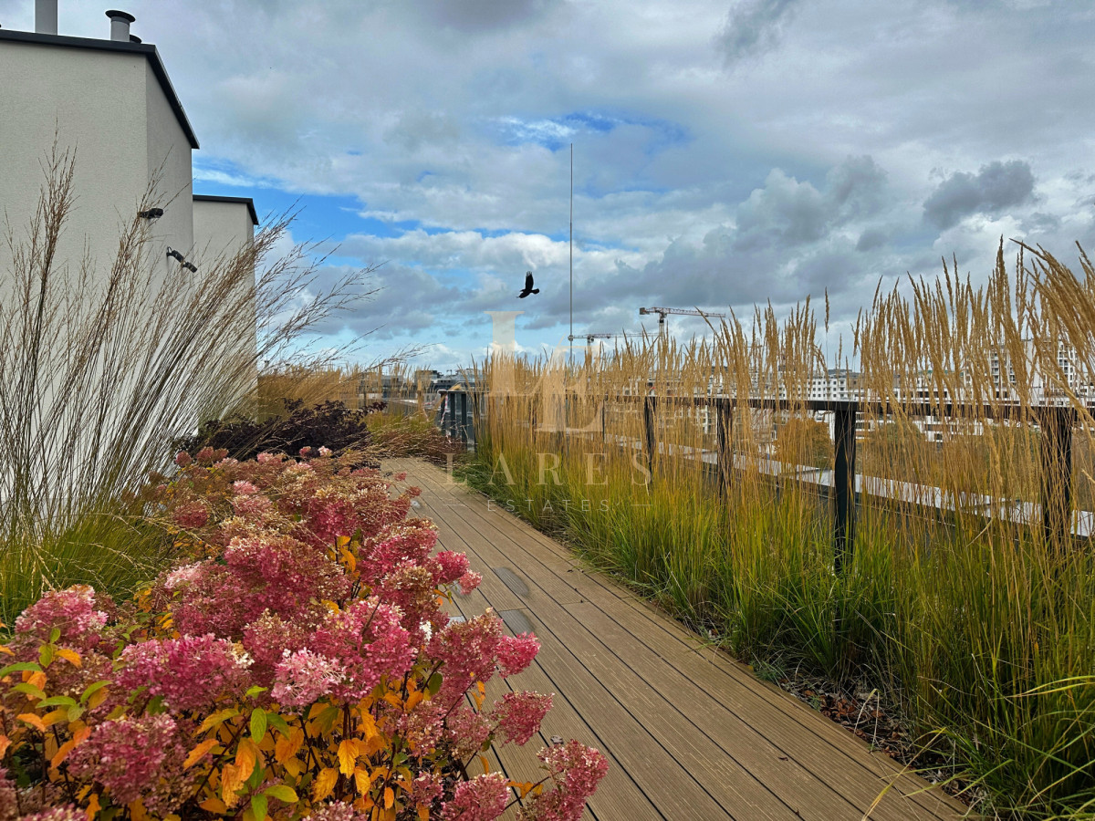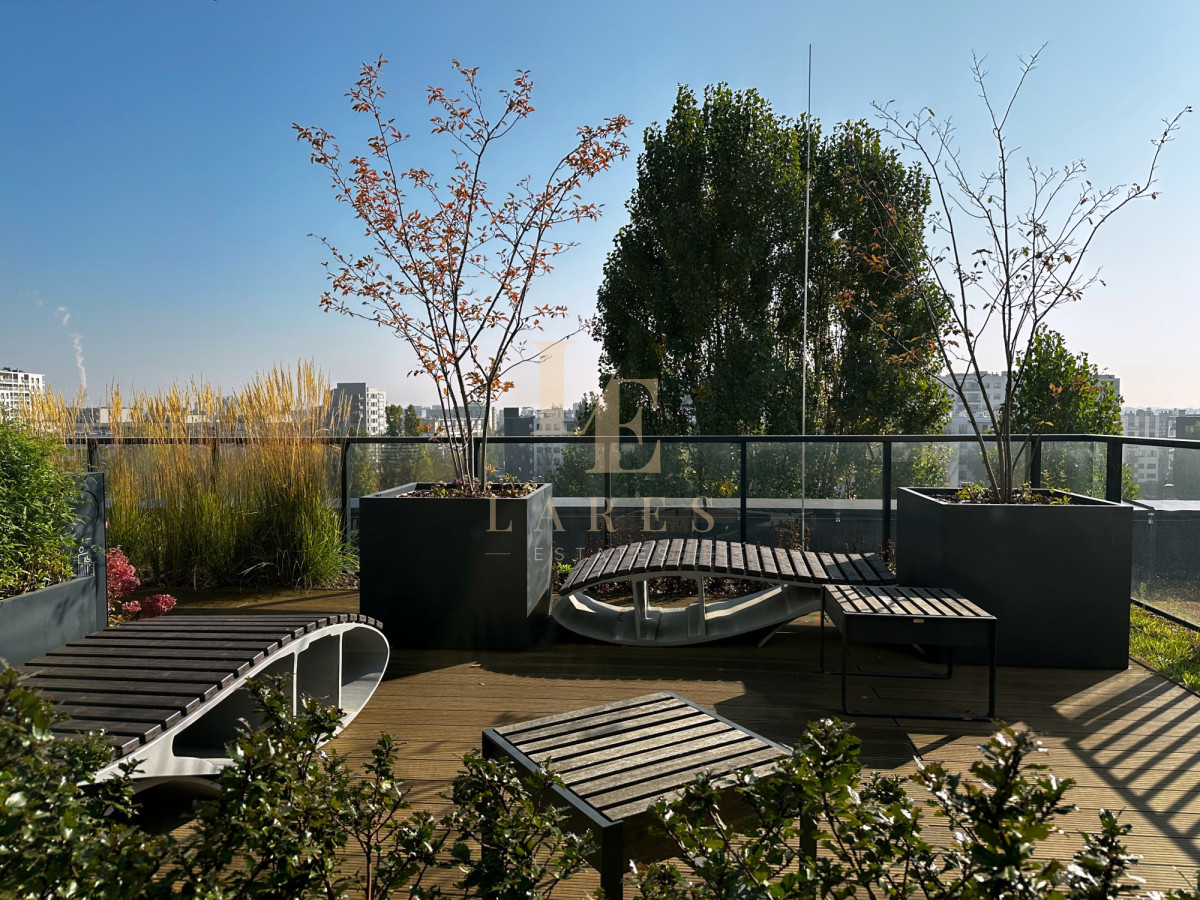Na dachu znajduje się przestronne, zielone patio z widokiem na panoramę miasta, wieżowce i lotnisko — idealne miejsce do odpoczynku z możliwością obserwowania startujących i lądujących samolotów.