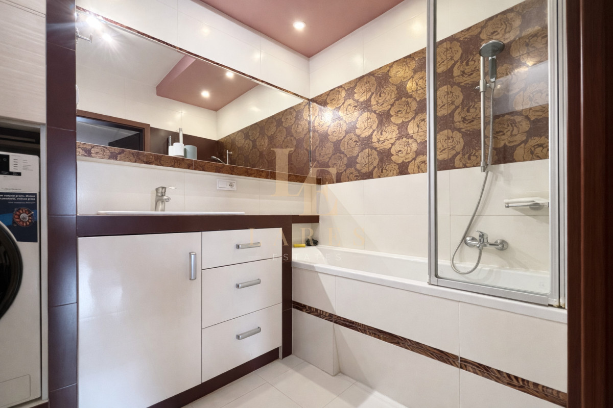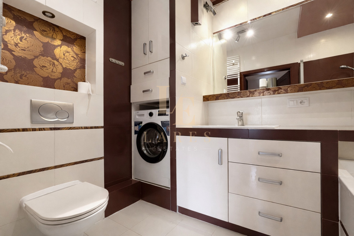 Łazienka: wyposażona w pralkę, lusterko, wannę oraz szafki