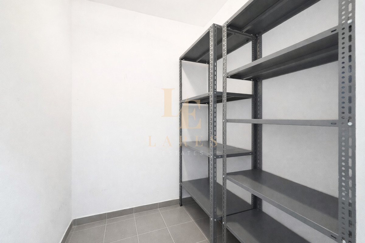 Komórka lokatorska wyposażona w regały metalowe i znajduje się na tym samym piętrze.