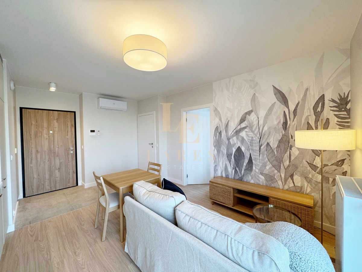 Salon z bezpośrednim wyjściem na balkon wyposażony jest w kanapę z stolikiem kawowym, stoł z dwoma krzesłami, szafkę pod TV, klimatyzację oraz zasłony.