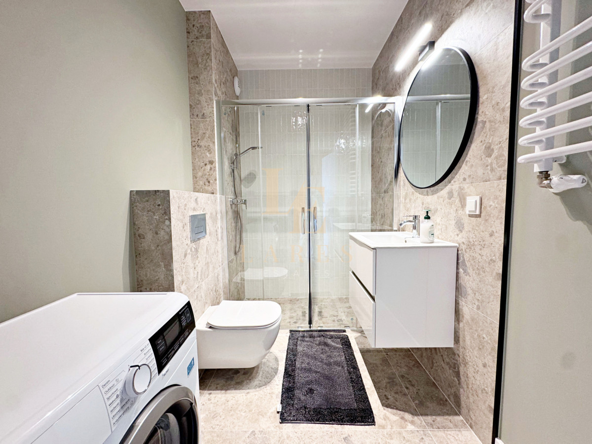 Łazienka wyposażona jest w prysznic, pralkę i szafki.