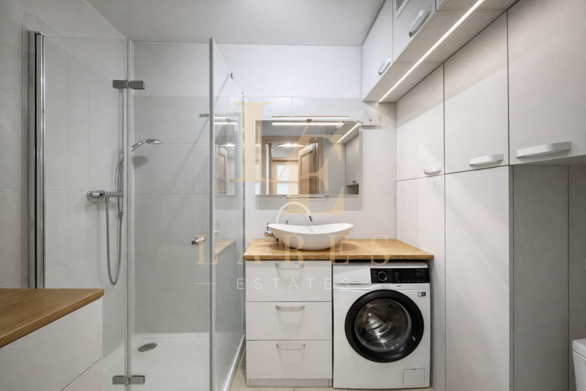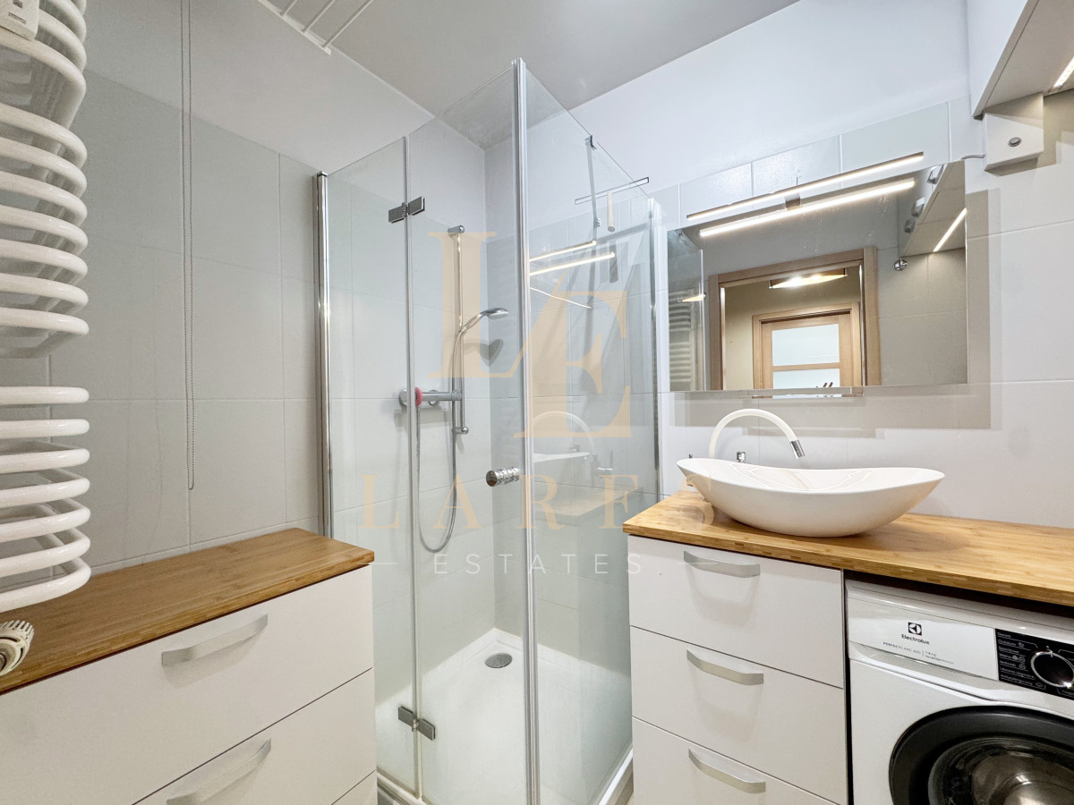 Łazienka wyposażona jest w prysznic oraz pralkę + WC z bidetem.