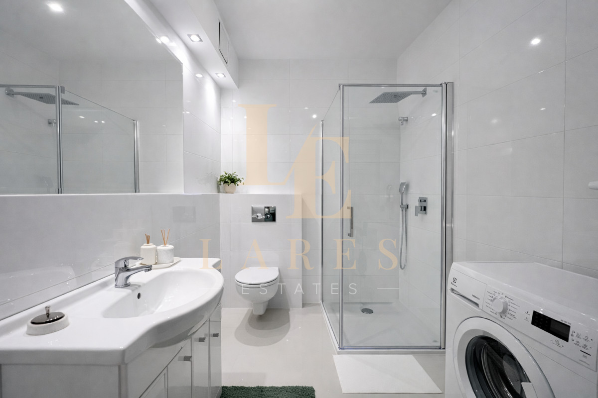 • Łazienka z prysznicem, pojemną zabudową i pralką
