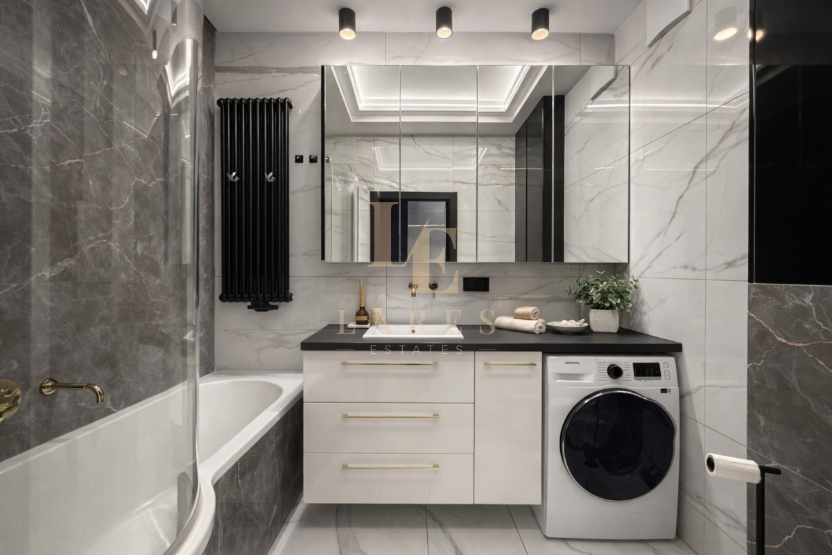 Łazienka została wyposażona w wannę i utrzymana jest w ponadczasowej, eleganckiej estetyce.