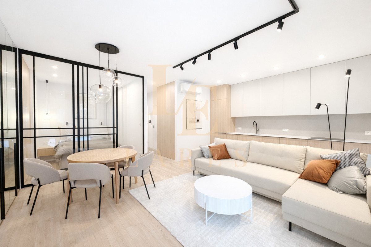 Mieszkanie składa się z jasnego salonu połączonego z nowoczesnym aneksem kuchennym, eleganckiej sypialni, łazienki z wanną, przedpokoju oraz tarasu 40m2. Mieszkanie jest w pełni wyposażone i gotowe do wprowadzenia się - posiada szafy i meble w zabudowie, przepiękne oświetlenie.