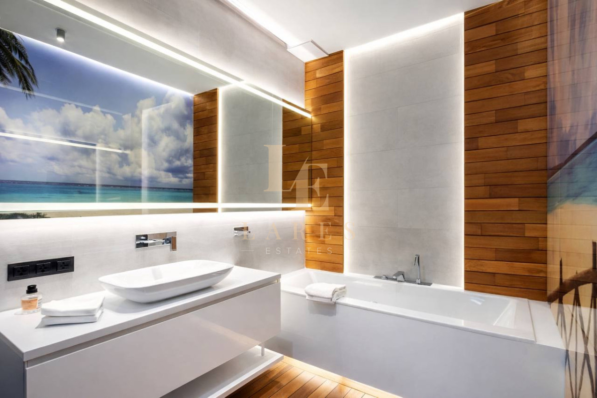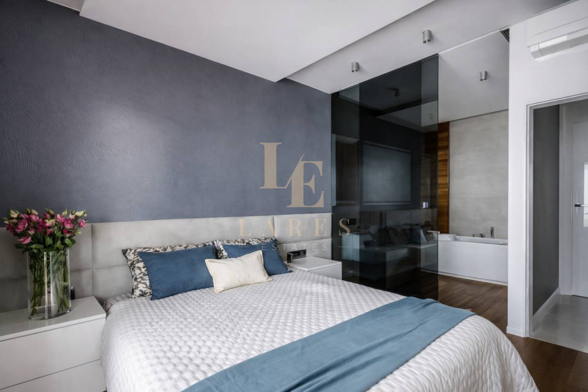Master Bedroom wyposażona w duże łóżko małżeńskie 160x200 cm, telewizor, klimatyzację oraz przeszkloną, designerską łazienkę oddzieloną ścianą z grafitowego szkła. W łazience znajduje się duża wanna oraz oryginalna grafika przedstawiająca plażę w Indonezji.
