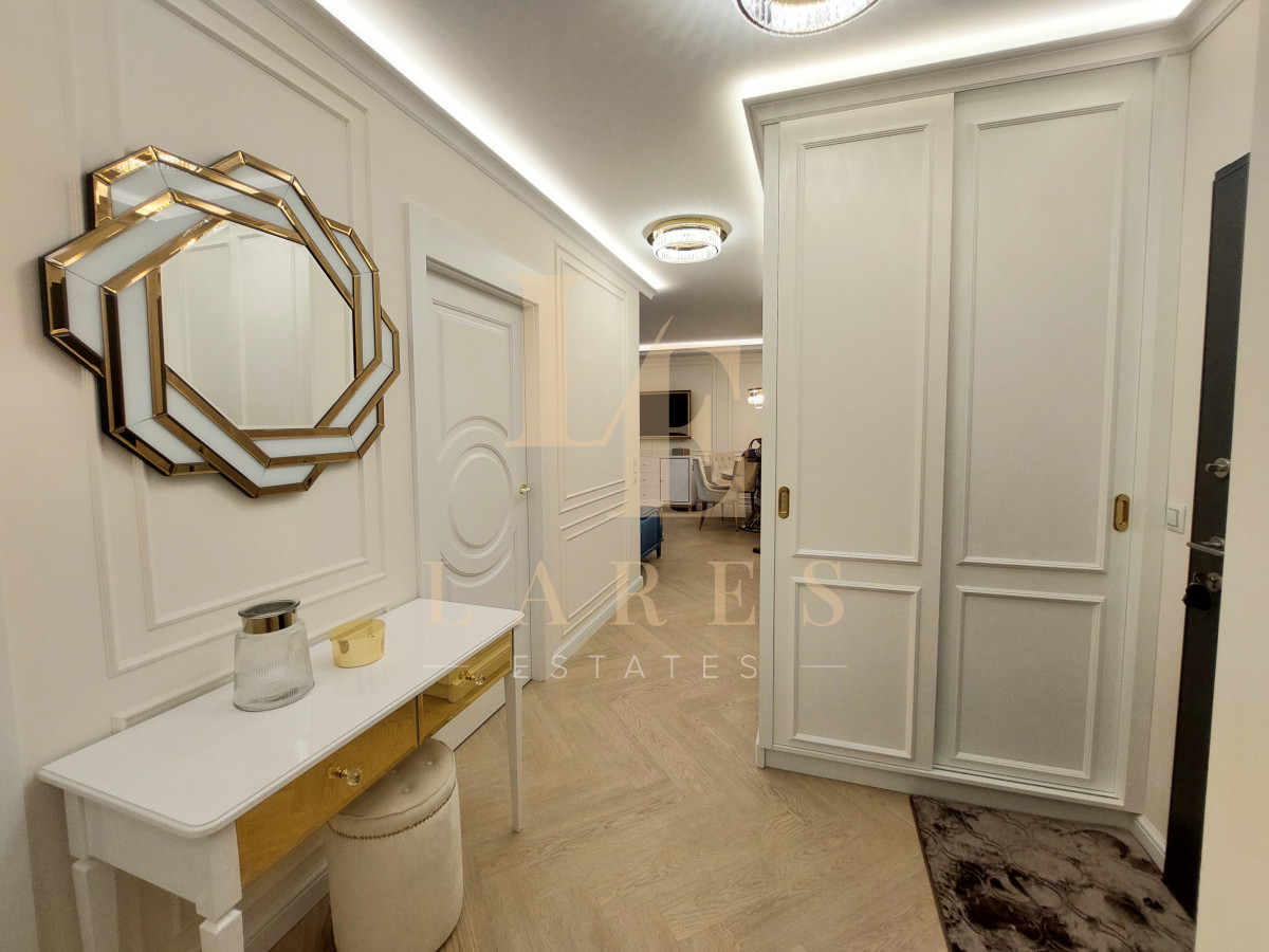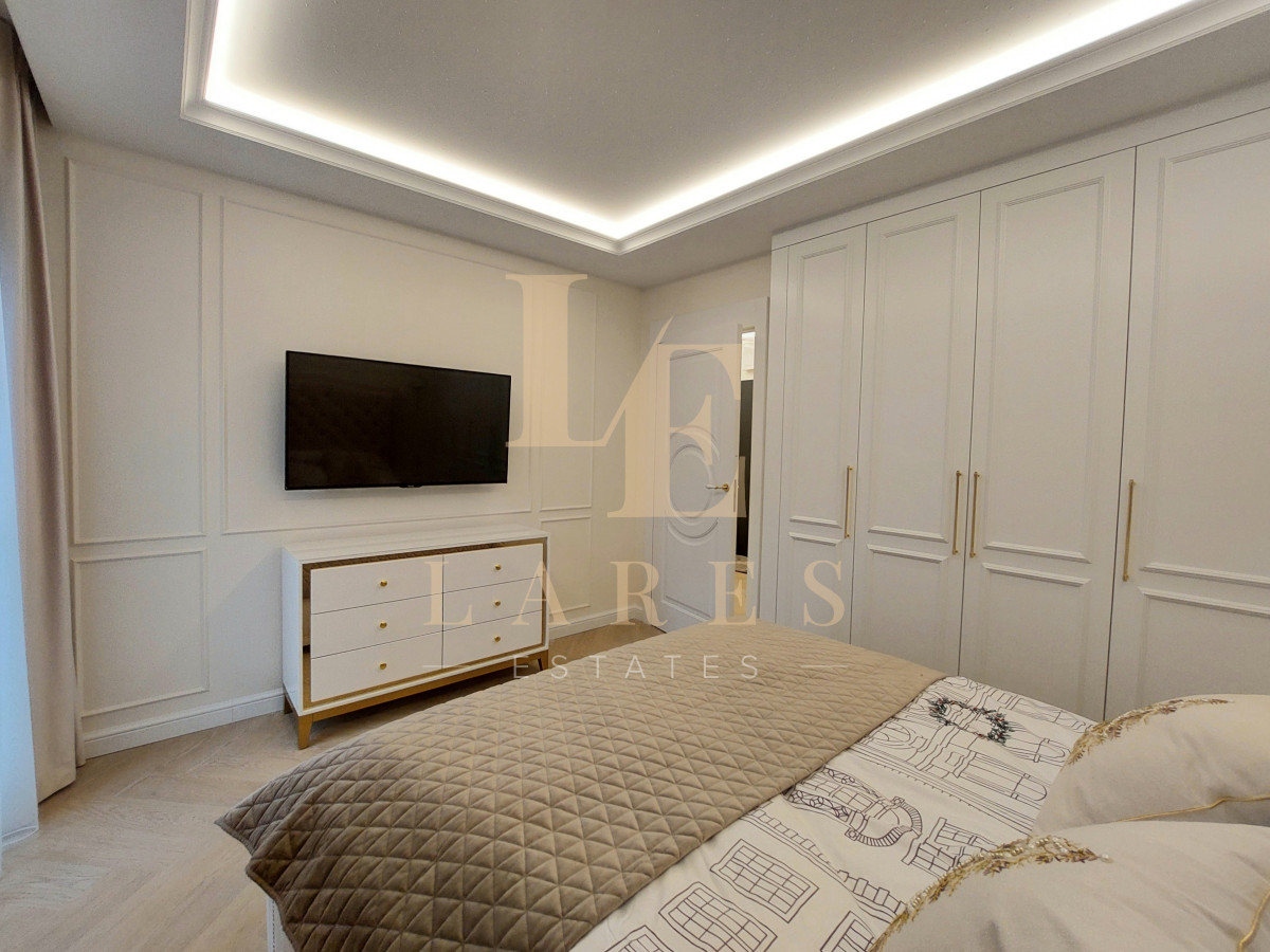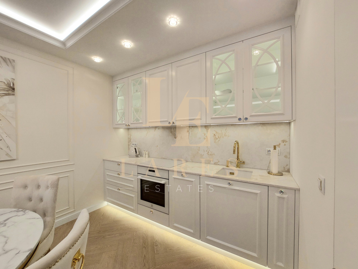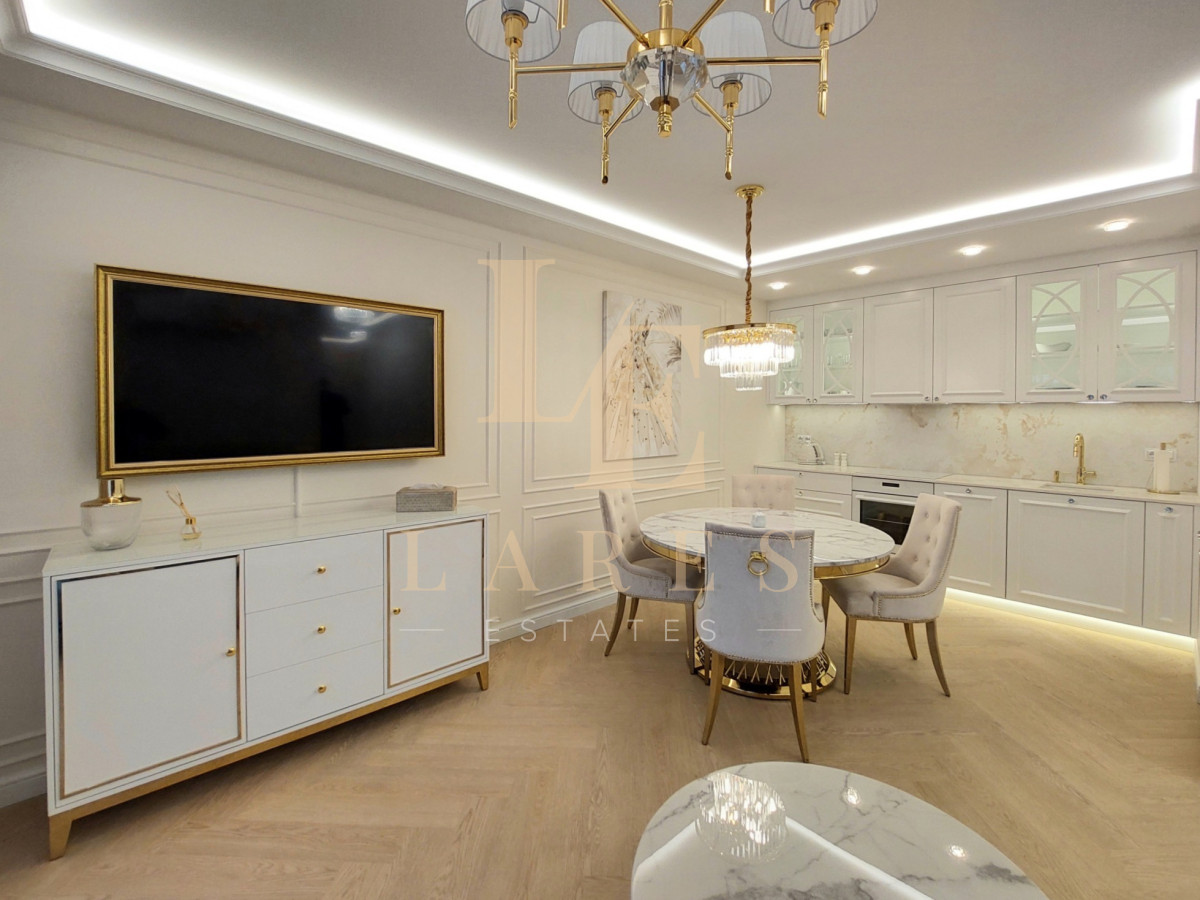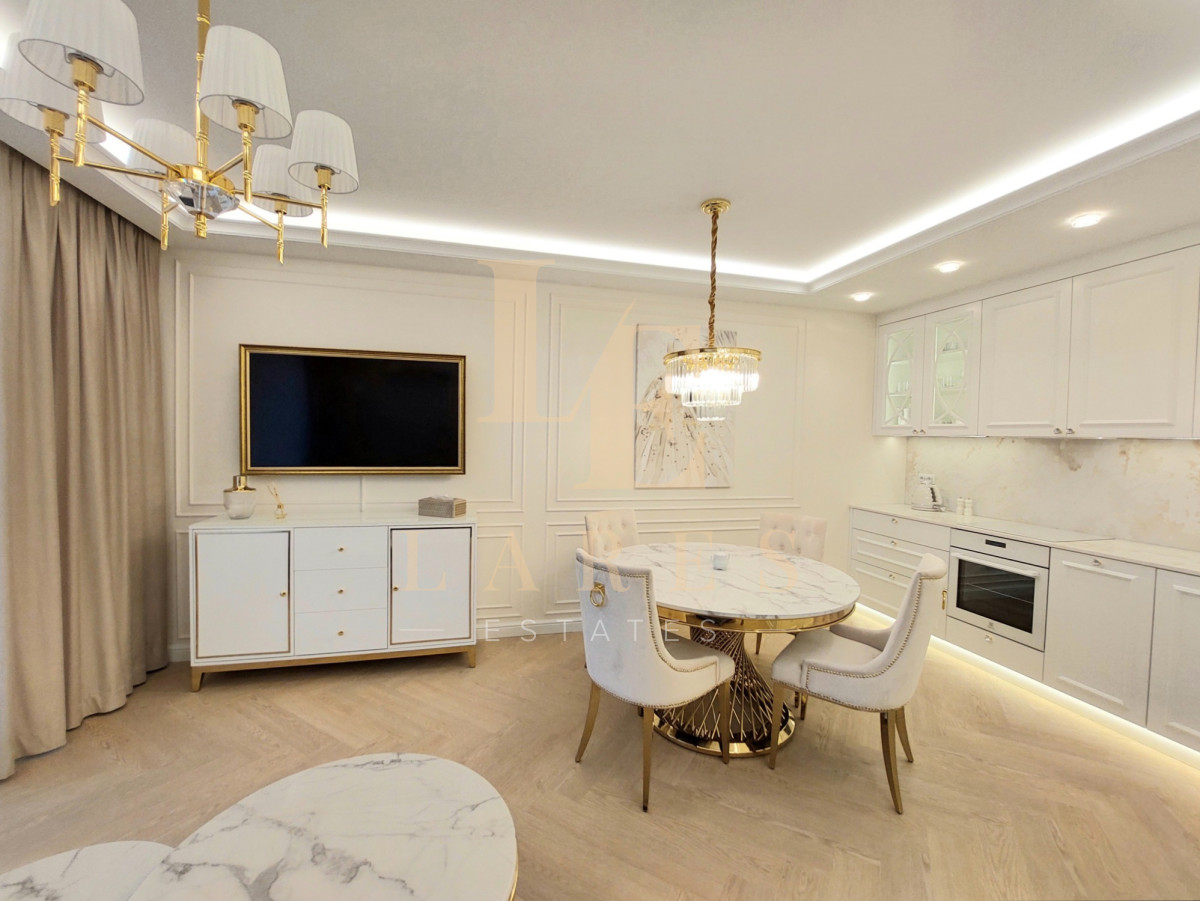 Duży, jasny salon połączony z aneksem kuchennym w pełni umeblowany z klimatyzacją. Kuchnia wyposażona w wysokiej jakości sprzęt AGD (lodówka, zmywarka, płyta indukcyjna, piekarnik, mikrofalówka). Bezpośrednie wyjście na taras.