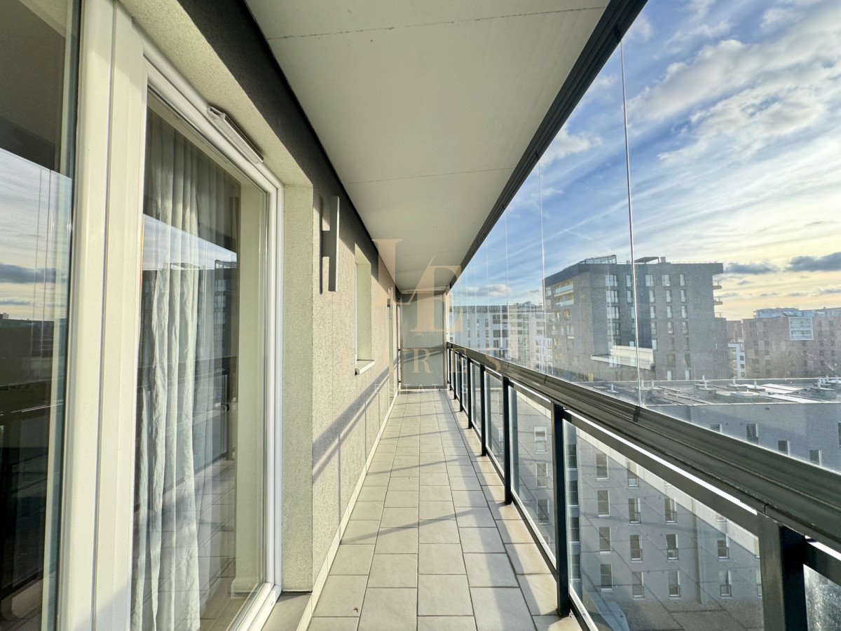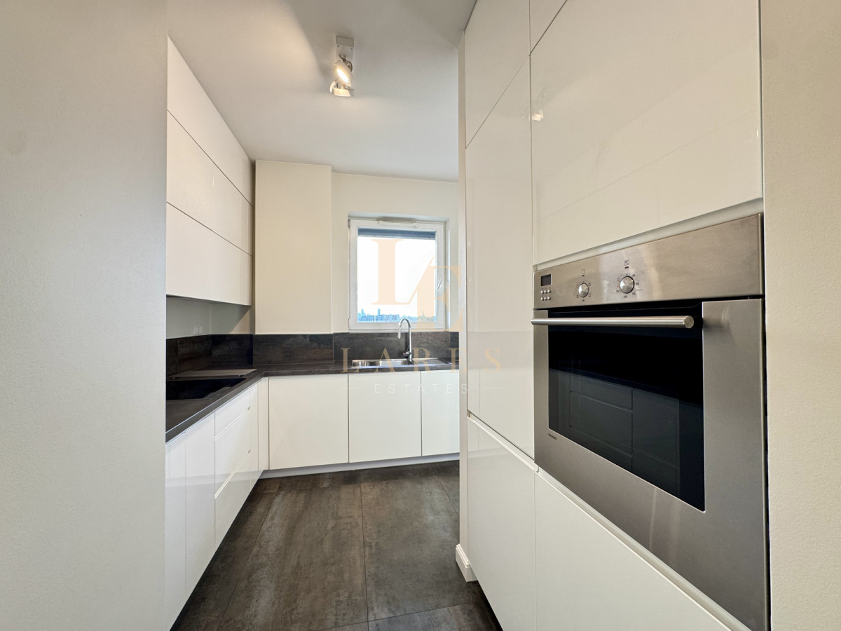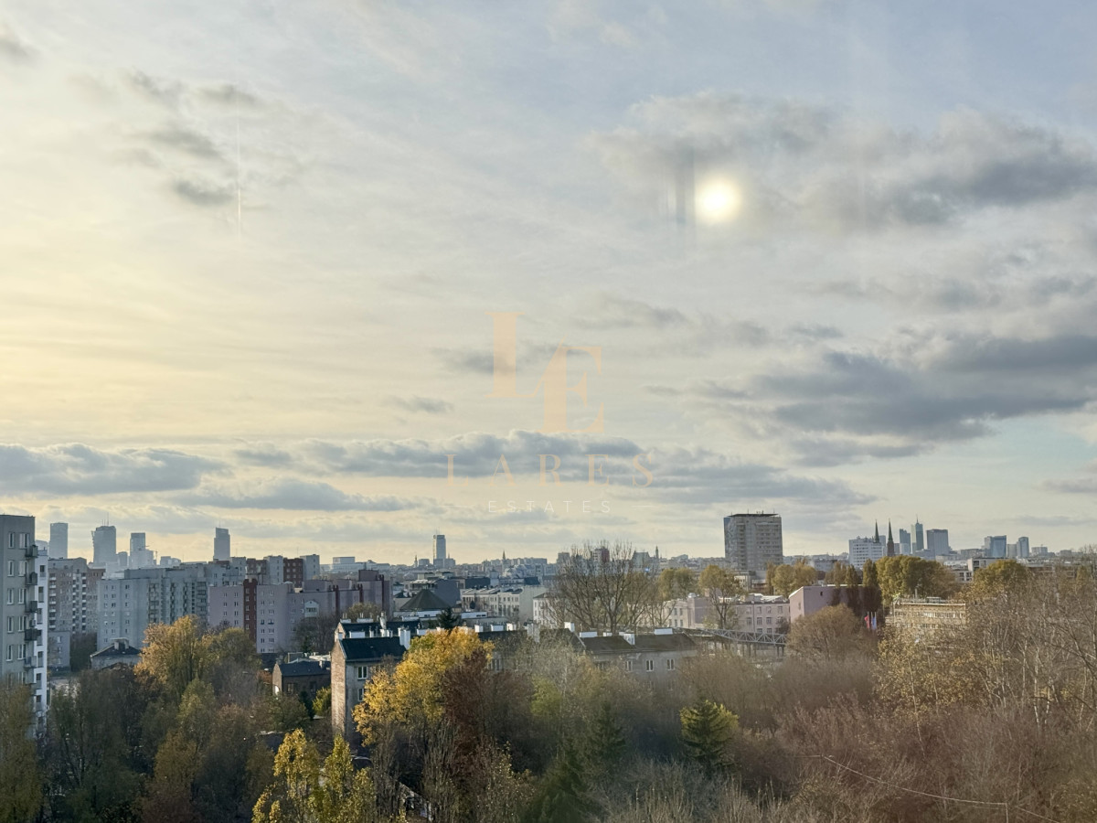 Z loggii rozciąga się widok na panoramę Warszawy.
