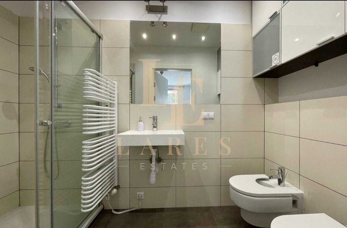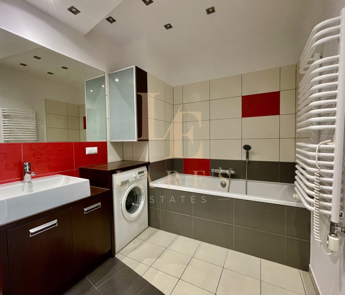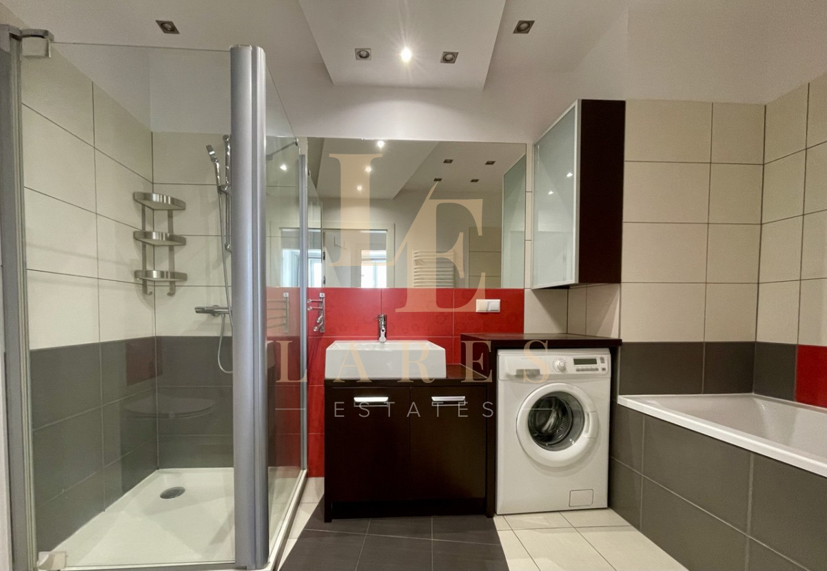 • przestronna łazienka z wanną, prysznicem, WC, umywalką, pralką, szafkami.
