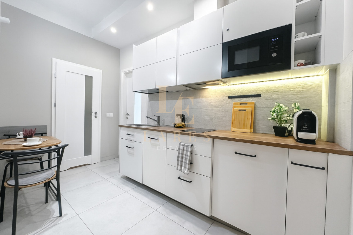 Kuchnia wyposażona jest w lodówkę, zmywarkę, kuchenkę indukcyjną, czajnik, ekspres do kawy, mikrofalę, stół z krzesłami oraz pełną zastawę kuchenną.