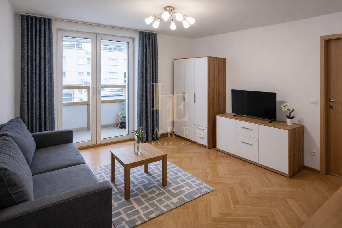 Salon: przestronny pokój dzienny z wyjściem na duży, 7-metrowy balkon, z którego rozpościera się widok na całe centrum Warszawy.