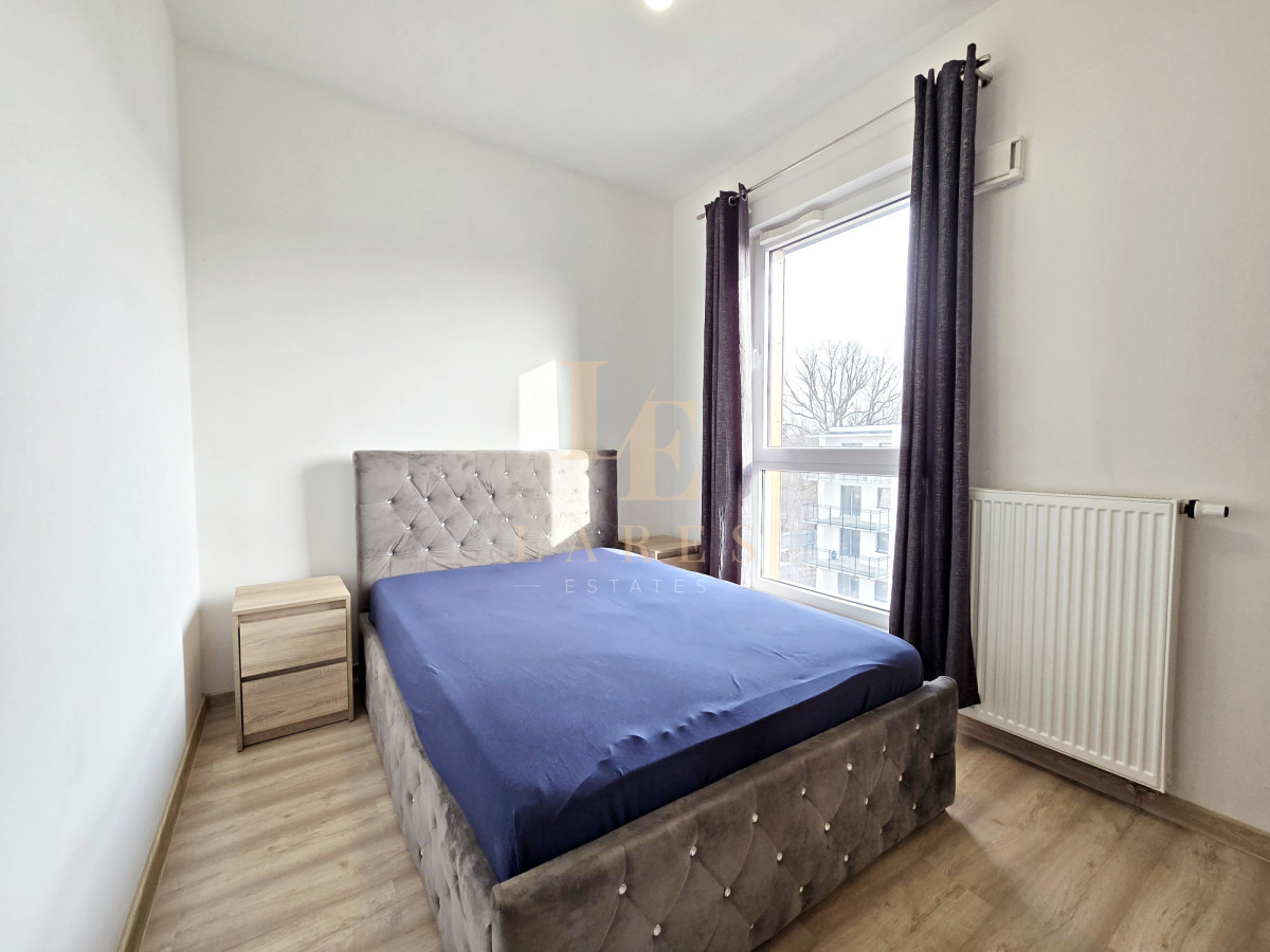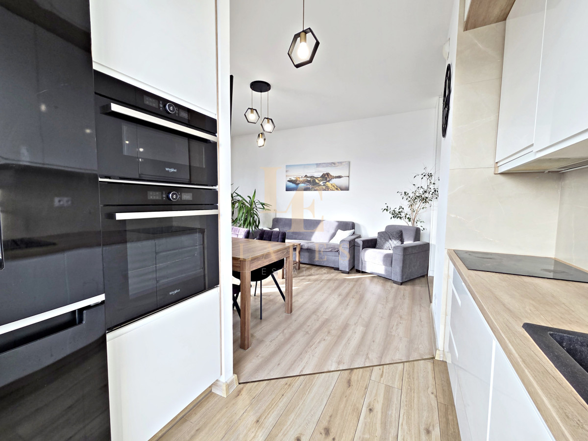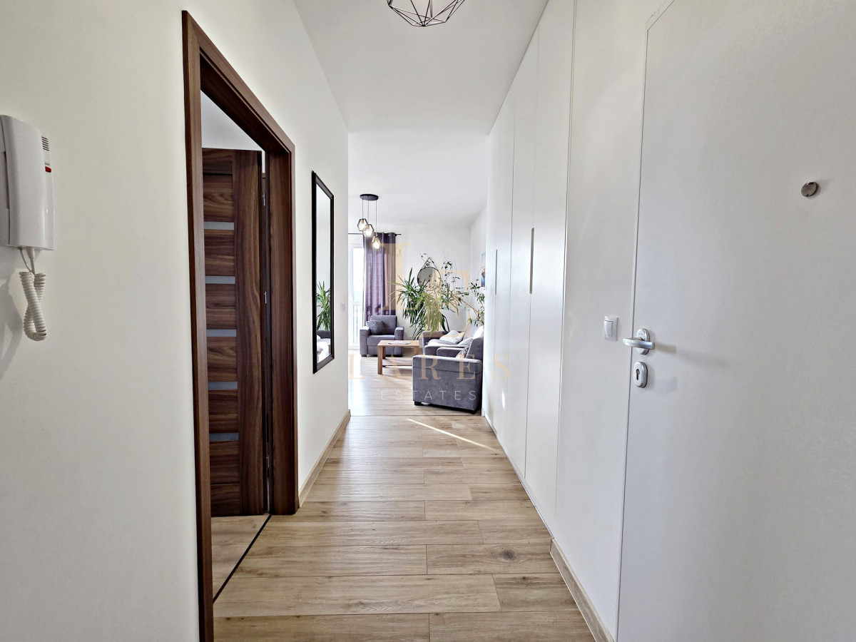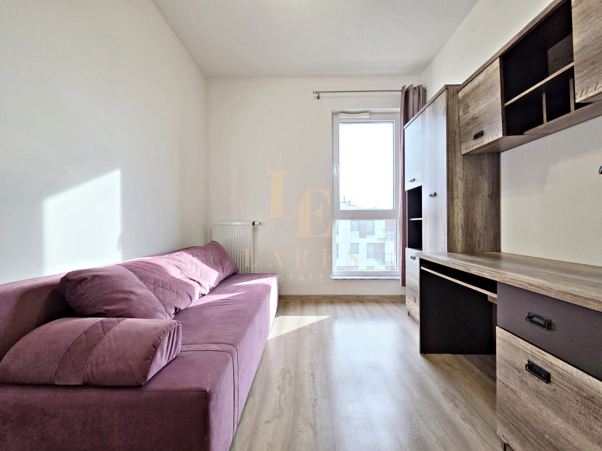 Na wynajem narożne trzypokojowe mieszkanie o powierzchni 56,5 mkw w kameralnym niskim bloku z 2022 roku na ostatnim 3 piętrze. Lokal składa się ze słonecznego salonu z aneksem kuchennym, sypialni, pokoju/gabinetu, łazienki z wanną oraz przedpokoju z szafami wnękowymi. Mieszkanie jest w pełni umeblowane i wyposażone w sprzęt AGD. Do dyspozycji najemcy jest również miejsce parkingowe w garażu podziemnym w cenie.