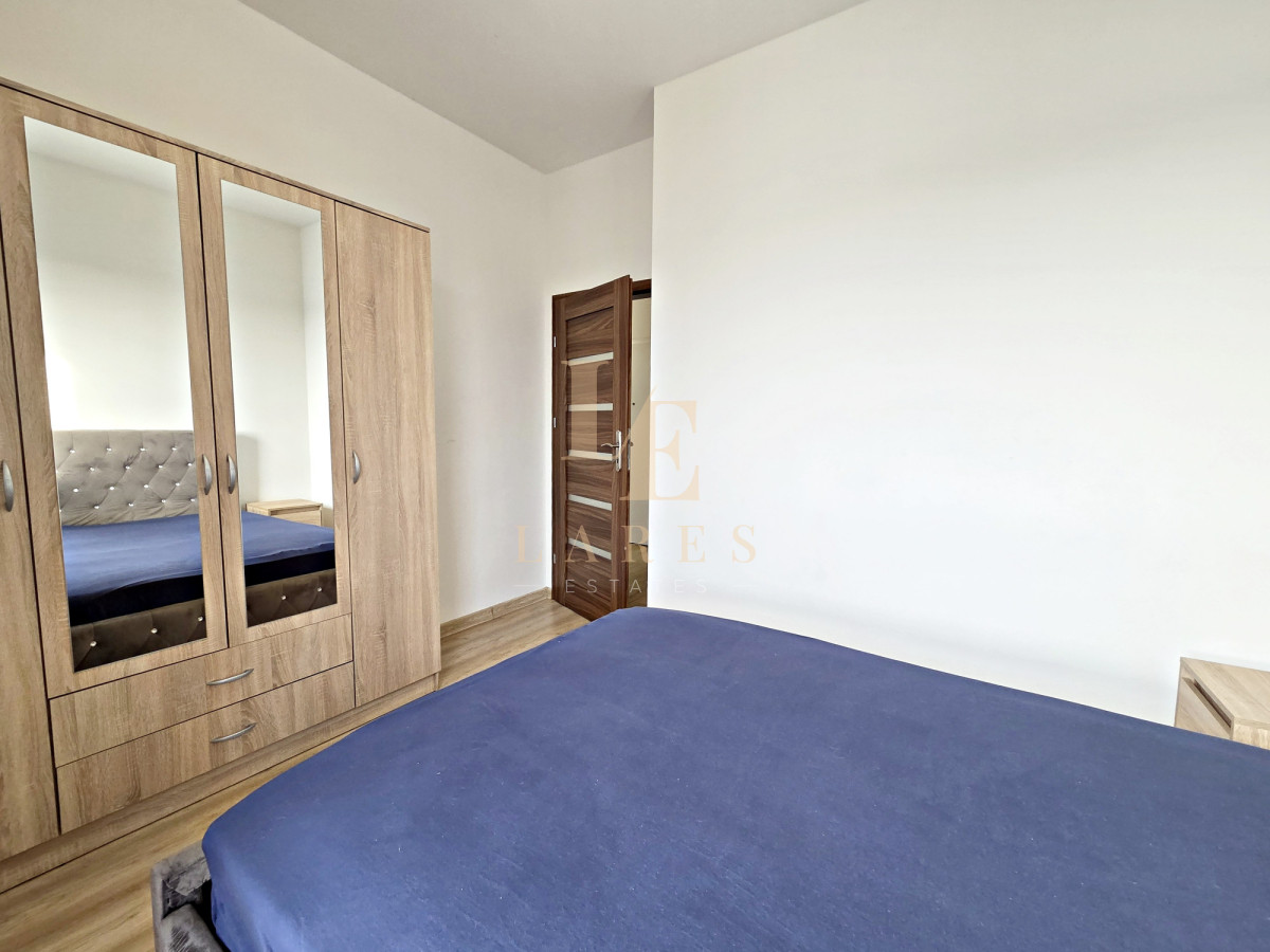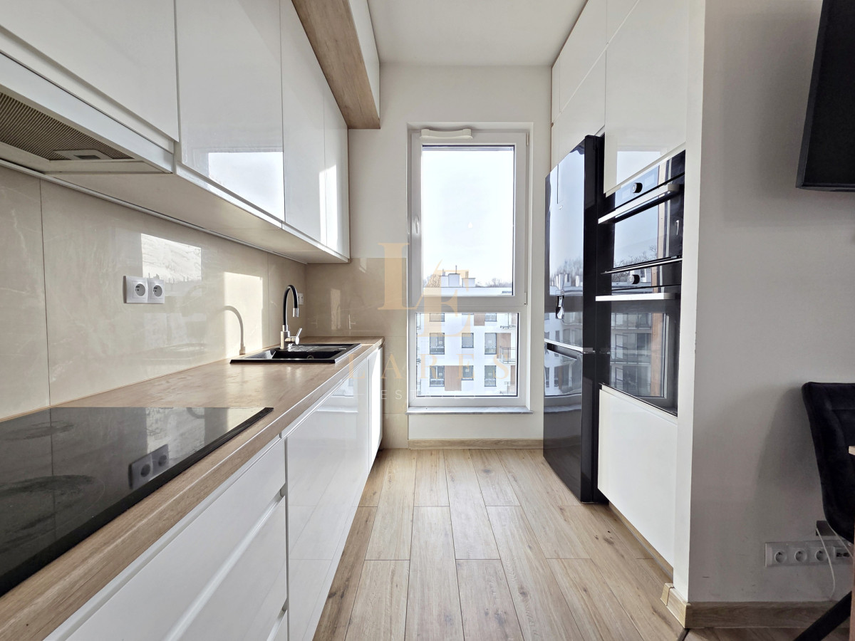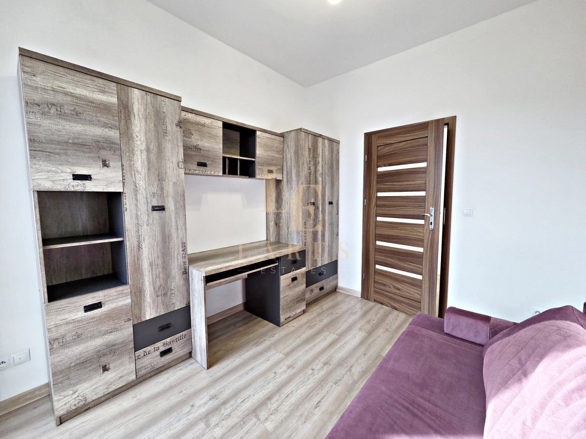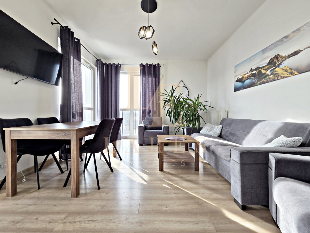 Na wynajem narożne trzypokojowe mieszkanie o powierzchni 56,5 mkw w kameralnym niskim bloku z 2022 roku na ostatnim 3 piętrze. Lokal składa się ze słonecznego salonu z aneksem kuchennym, sypialni, pokoju/gabinetu, łazienki z wanną oraz przedpokoju z szafami wnękowymi. Mieszkanie jest w pełni umeblowane i wyposażone w sprzęt AGD. Do dyspozycji najemcy jest również miejsce parkingowe w garażu podziemnym w cenie.