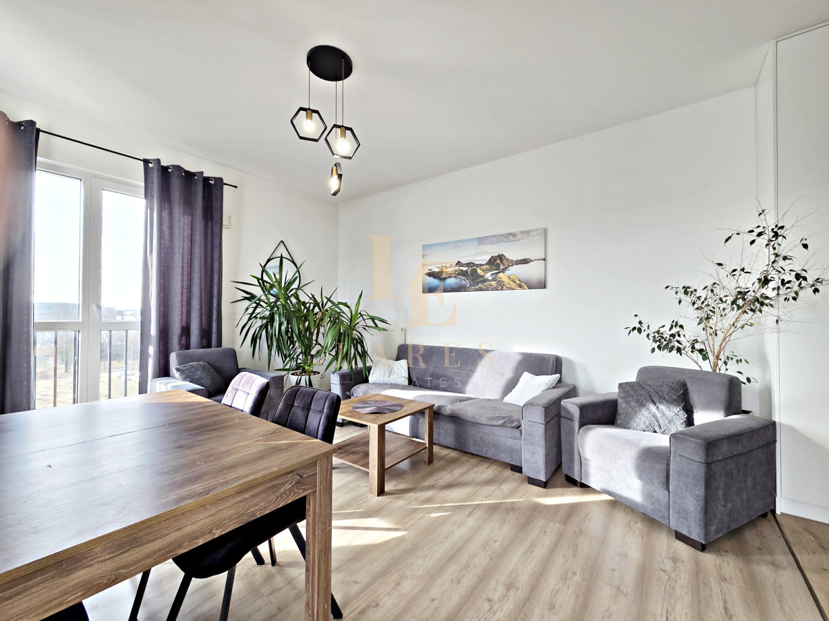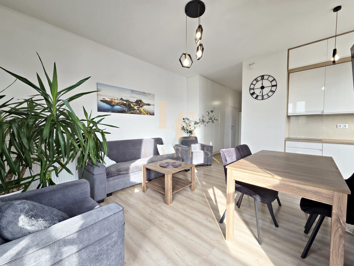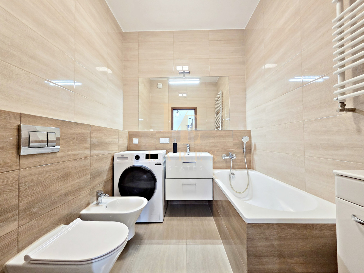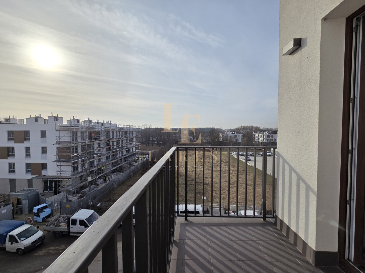 Na wynajem narożne trzypokojowe mieszkanie o powierzchni 56,5 mkw w kameralnym niskim bloku z 2022 roku na ostatnim 3 piętrze. Lokal składa się ze słonecznego salonu z aneksem kuchennym, sypialni, pokoju/gabinetu, łazienki z wanną oraz przedpokoju z szafami wnękowymi. Mieszkanie jest w pełni umeblowane i wyposażone w sprzęt AGD. Do dyspozycji najemcy jest również miejsce parkingowe w garażu podziemnym w cenie.