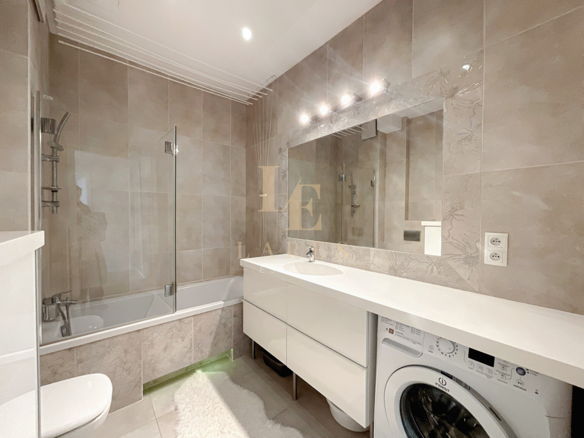- Łazienki z pralką, wanną z funkcją prysznica, pojemnymi szafkami i podwieszaną suszarką na pranie,