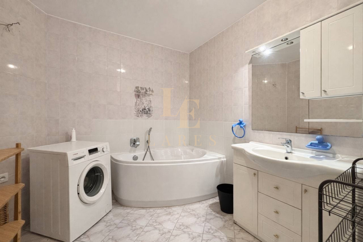 Łazienka 1 wyposażona w wannę , pralkę, szafę oraz lustro