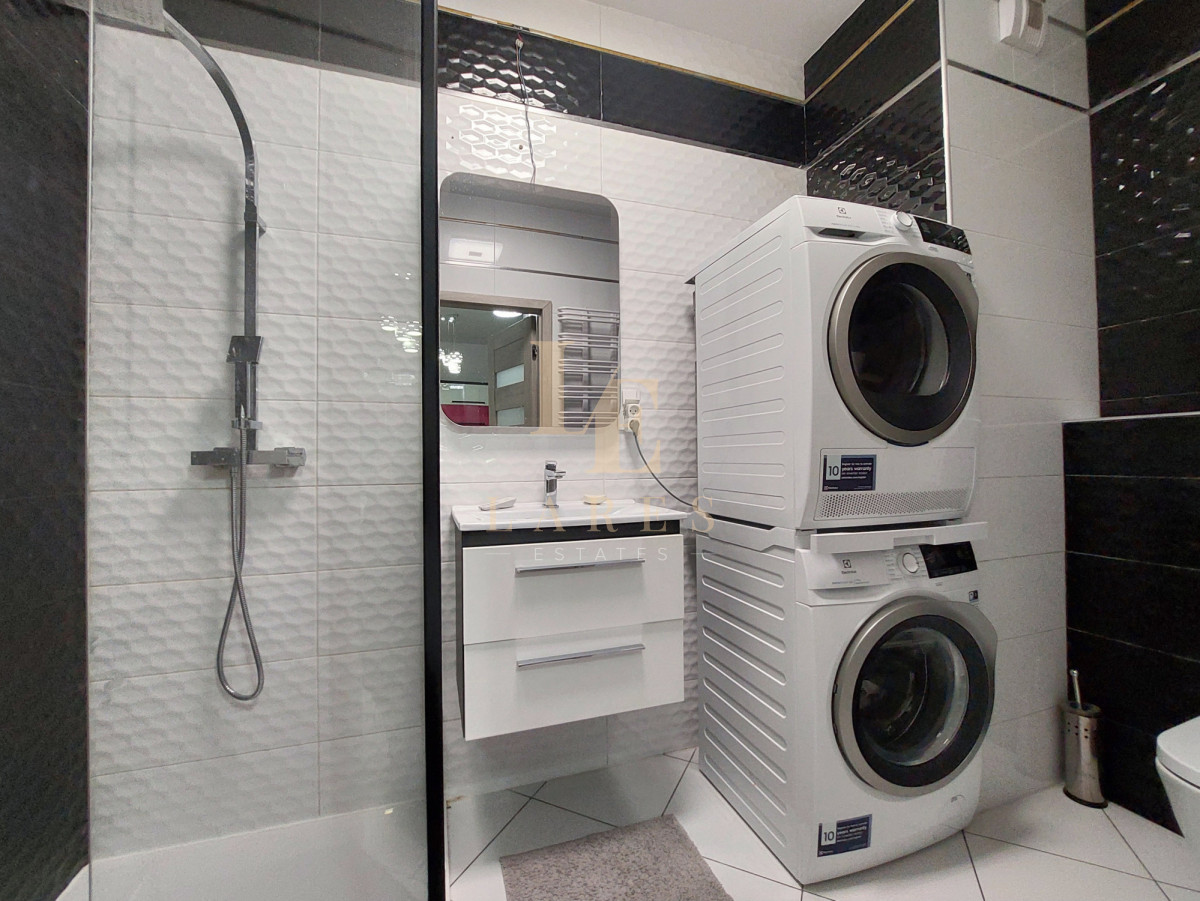 Sypialnia wyposażona w duże łóżko, dużą szafę, komodę. Salon wyposażony jest w sofę, biurko, szafkę pod TV. Kuchnia wyposażona jest w lodówkę, zmywarkę, kuchenkę indukcyjną, stół z krzesłami. Łazienka wyposażona jest w prysznic oraz pralkę i suszarkę.