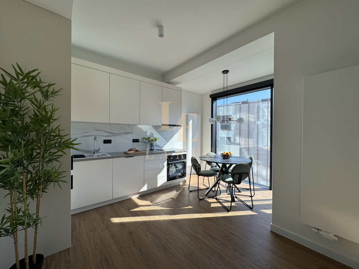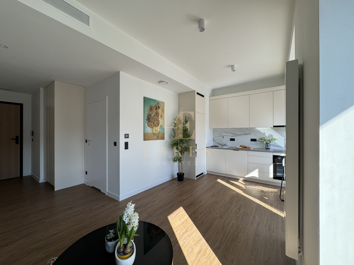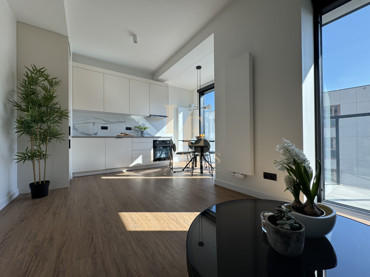 - Jasny salon z aneksem kuchennym oraz wyjściem na balkon