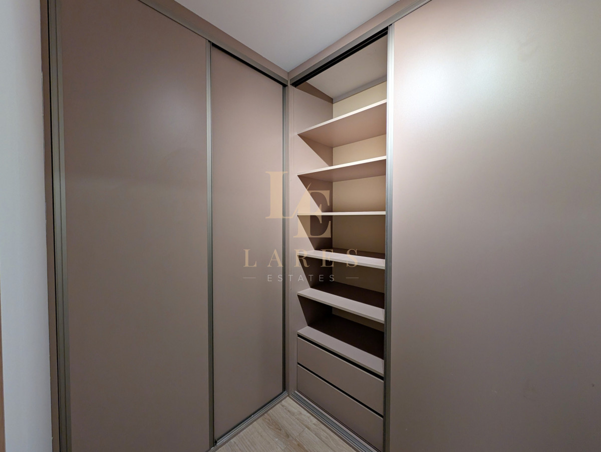 Apartament składa się z dużego salonu, oddzielnej sypialni (z obu pomieszczeń jest bezpośrednie wyjście na taras), funkcjonalnej garderoby, kuchni otwartej na salon oraz łazienki. Mieszkanie jest w pełni umeblowane i wyposażone w sprzęt RTV i AGD.