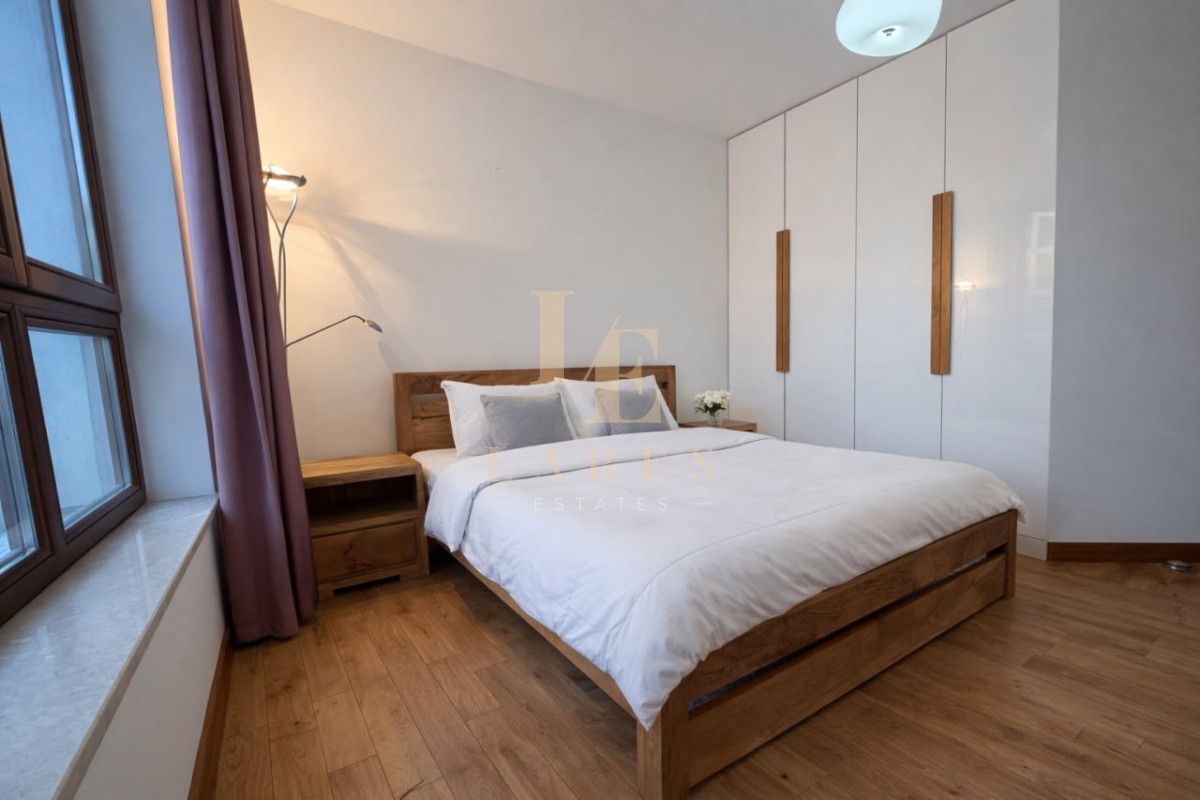 - Sypialnia główna z dużym łóżkiem, dwiema szafkami nocnymi, pojemnymi szafami w zabudowie.